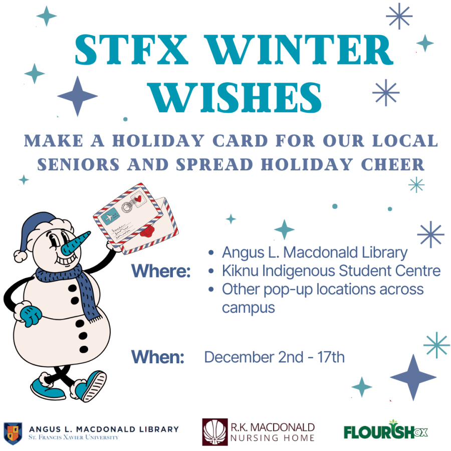 The Angus L. Macdonald Library has partnered with Flourish at X and the R.K to make holiday cards and drop them off for residents on December 19. Stop by the Library, Kiknu or pop up tables around campus to make a holiday card starting on December 2nd!