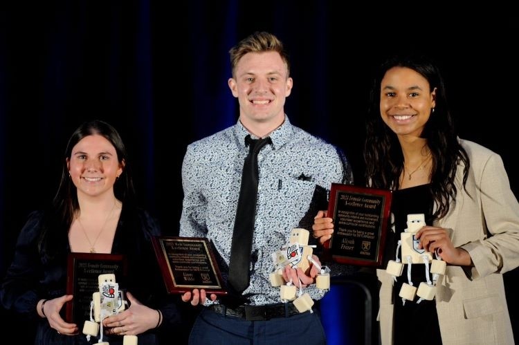 The StFX Athletic Department honoured the athletic accomplishments of their varsity athletes this week at the Athletic Awards Gala held Tuesday evening, April 4, 2023, at the Charles V. Keating Centre. X-Women Hockey forward Maggy Burbidge was named the StFX Female Student-Athlete of the Year, while X-Men Basketball forward David Muenkat received StFX Male Student-Athlete of the Year honours. The StFX Female Community X-Cellence award was co-awarded to Kathleen Dolan (X-Women Rugby) and Aliyah Fraser (X-Women Basketball), while Liam Wilde from X-Men Football was the winner of the StFX Male Community X-Cellence award.