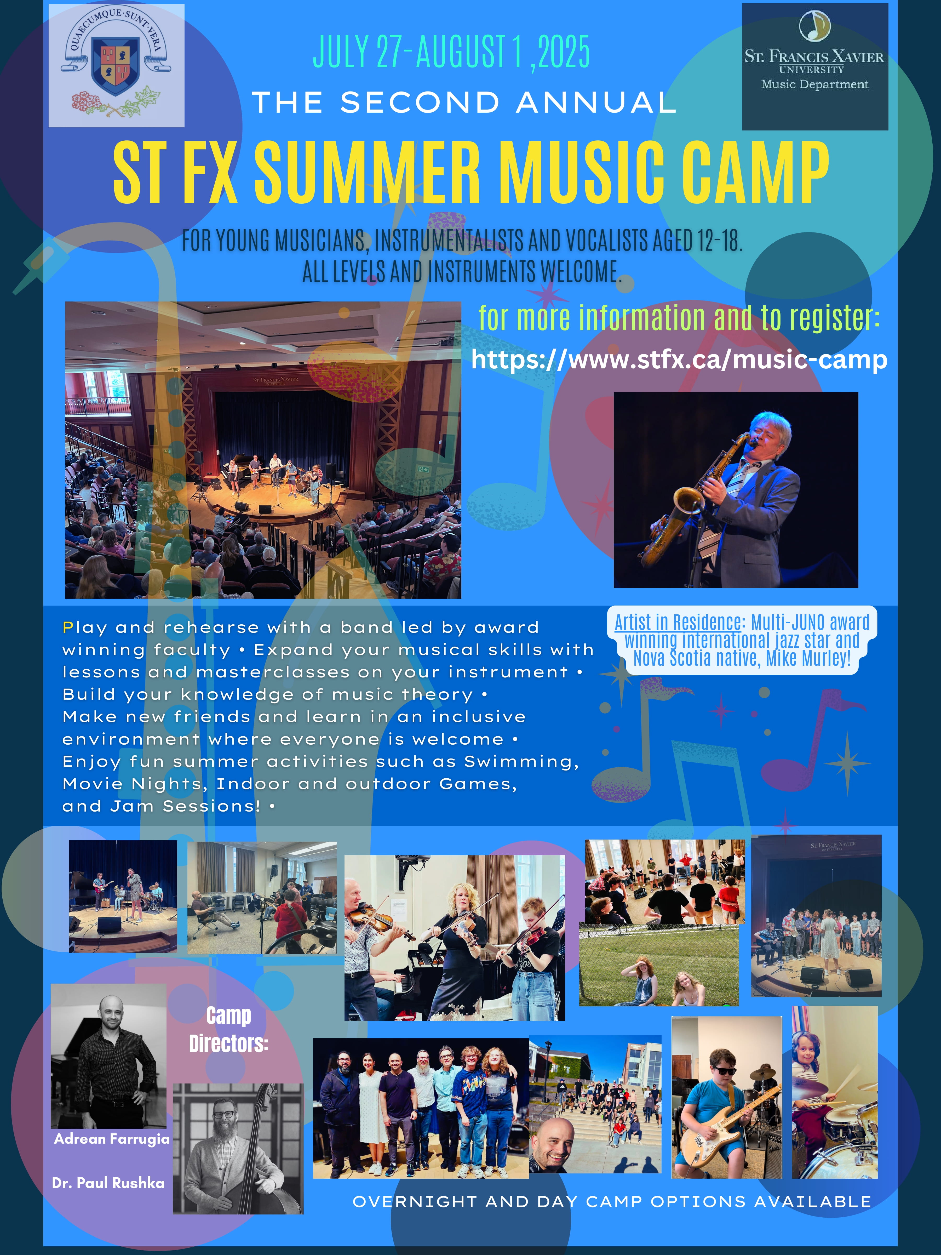 The St. FX Summer Music Camp is a unique and enriching opportunity for young musicians, where participants learn under the guidance of nationally and internationally recognized professional musicians and educators while gaining new skills and knowledge in a peer and mentor driven environment, all while making new friendships that will last a lifetime.
