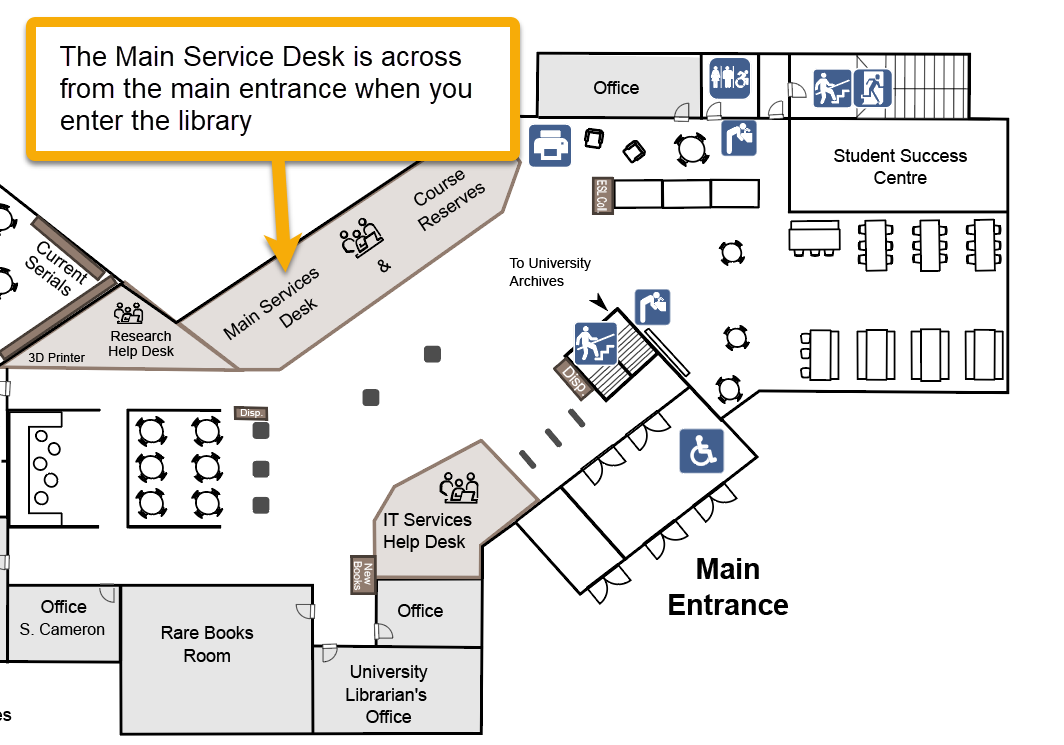 The Main Service Desk serves as the primary point of contact for faculty, students, staff, and community members seeking assistance with borrowing, returning, and renewing materials, as well as connecting you to with the appropriate person or department when extra help is needed.