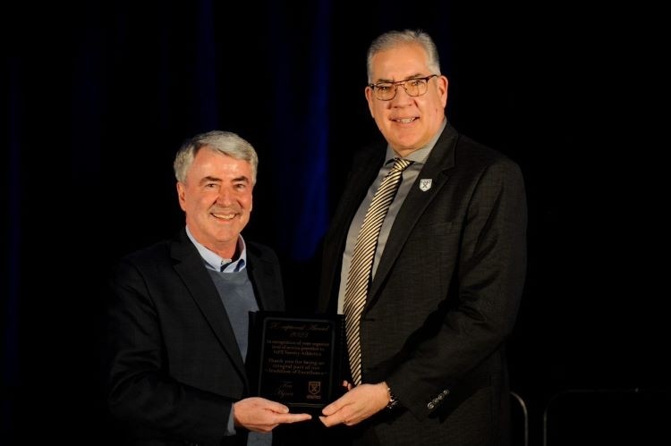 The ‘X-Ceptional Award’ which recognizes individuals who go above and beyond to contribute in a positive manner to StFX Athletics, was awarded to Dr. Tim Hynes. The Dean of Business at StFX's Schwartz School, Dr. Hynes is a long-time supporter of the StFX Athletics program and fulfills many key volunteer roles. He has served as a member of the Father Kehoe Golf Classic organizing committee for many years, and is a friendly and welcoming member each summer at the annual event. Dr. Hynes volunteers his time on the awards gala selection committee, and is a co-emcee of the annual StFX Sports Hall of Fame induction ceremony, along with filling other emcee roles in several other Athletics events and projects as the need arises. He plays an integral role in the recruitment of StFX student-athletes to all varsity teams, often taking the time to call or personally meet with prospective student-athletes. A longtime executive member of the X-Men Basketball booster club, Dr. Hynes is a generous supporter of all varsity teams and is a dedicated fan in attendance at the gymnasium, stadium, rink and trails, rarely missing a home game in any X-Men or X-Women sport. He truly bleeds blue and white and his devotion to StFX Athletics does not go unnoticed.