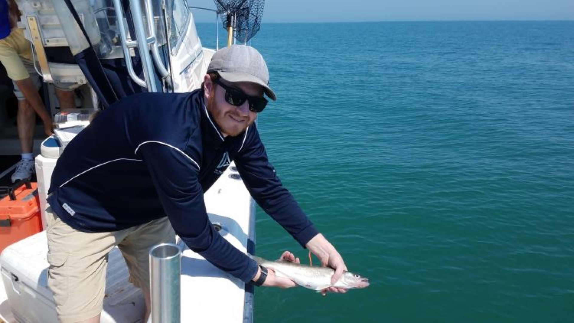 StFX aquatic resources professor Dr. Jordan Matley is pictured here in the field, tagging and releasing walleye in the Great Lakes.
