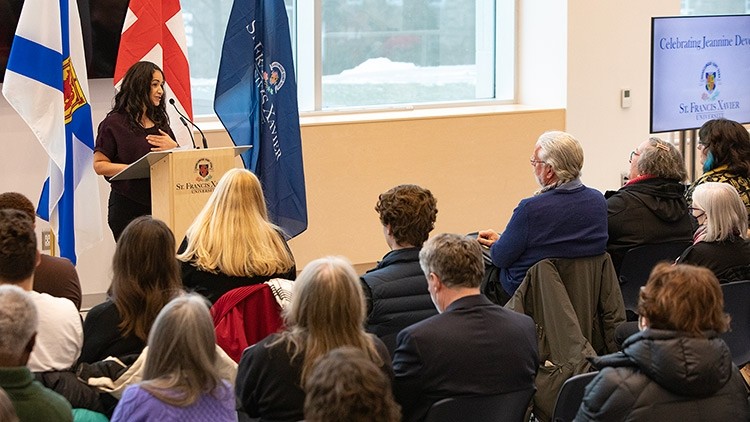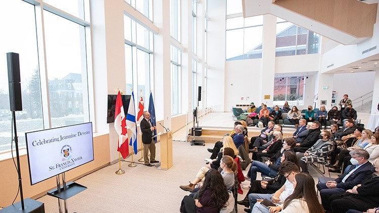 The life and legacy of a remarkable Xaverian was celebrated Jan. 25, 2023 as members of the StFX community gathered to pay tribute to the late Jeannine Deveau and the contributions she has made to StFX—impacting countless lives—during a ceremony held in the Joyce Family Atrium of Mulroney Hall.