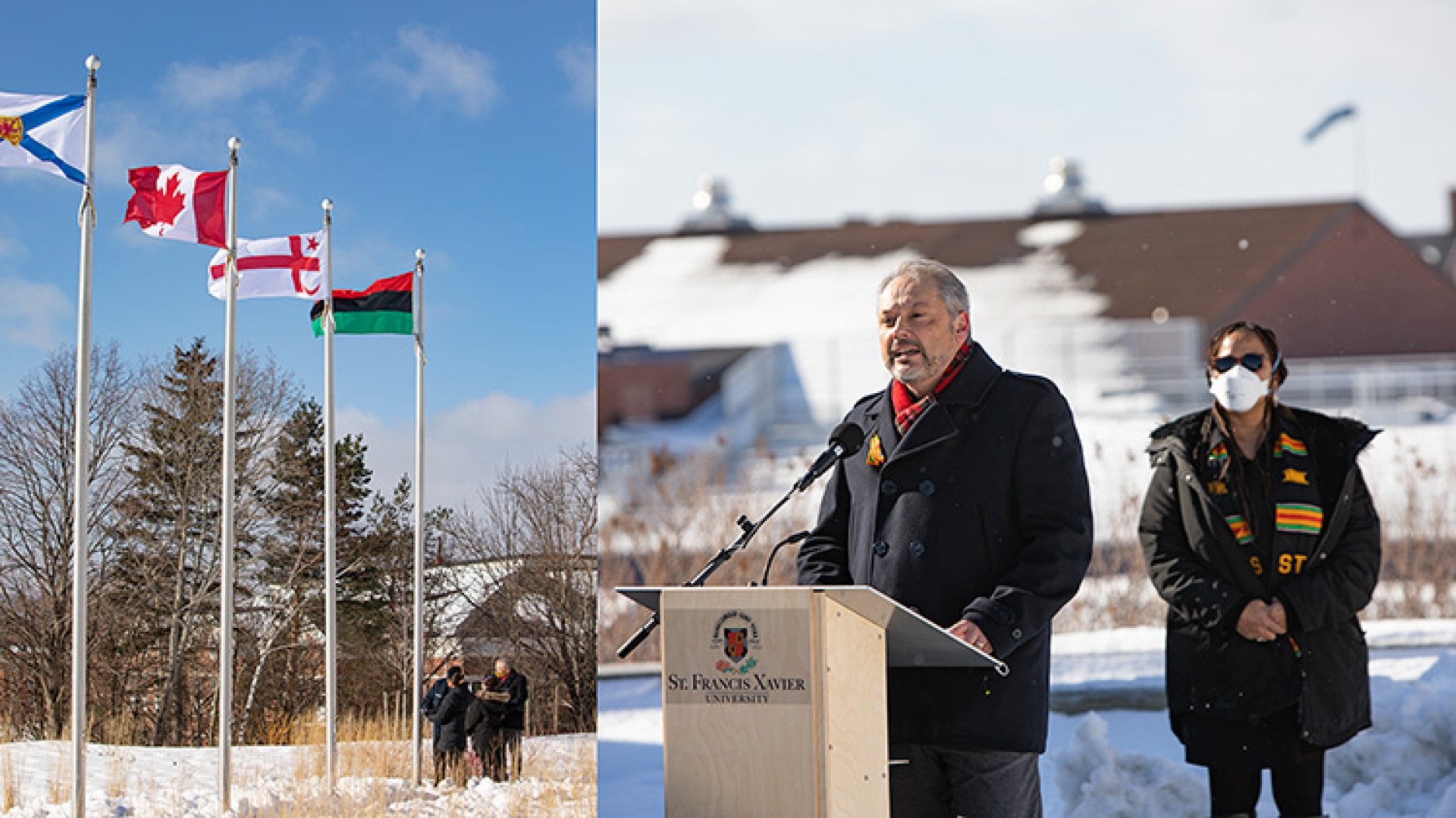 “Use this month as a time to learn, to grow and commit to creating a more inclusive campus and a community where we can be proud to live, a place where everyone can thrive,” Dr. Hakin said in remarks delivered outdoors before joining with StFX education professor Dr. Wendy Mackey to raise the Pan African flag at Flag Plaza on the StFX campus.